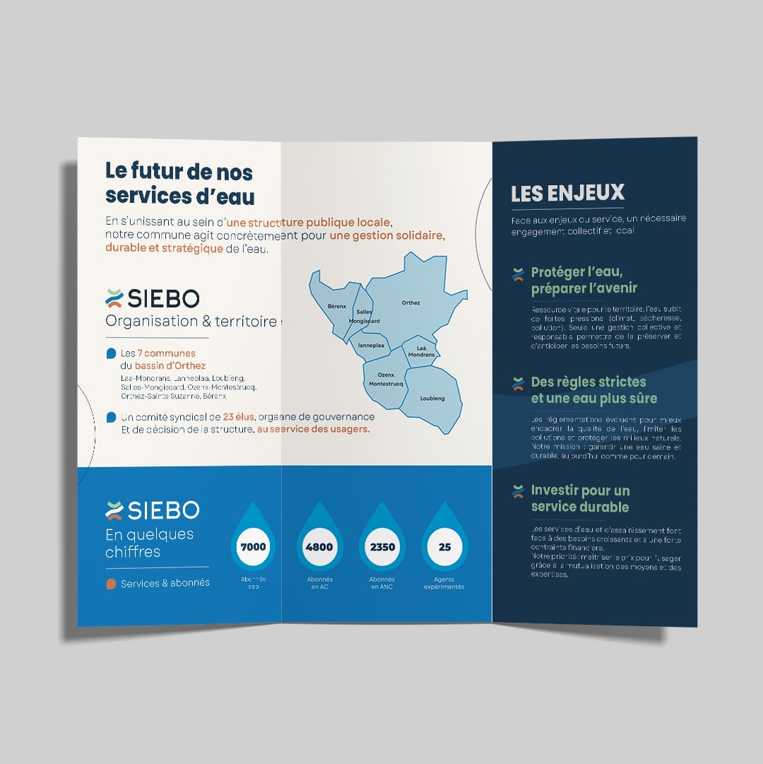 Dans la continuité des prestations de création de logo et carte de visite pour le Syndicat Intercommunal des Eaux du Bassin d’Orthez, l’agence Makhila Com s’est chargée de la déclinaison de l’identité et du message de présentation dans un dépliant 2 volets 6 pages.